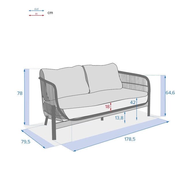 Les accoudoirs enveloppants et les coussins épais assureront votre confort pour vous prélasser pendant des heures. Deux personnes pourront prendre place sur le canapé « DEONA » pour profiter du plein air.